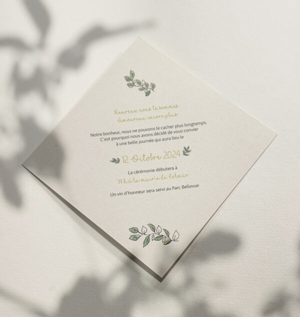 Le faire-part végétal promet de transporter vos convives dans l’atmosphère de votre union dès la première lecture, suscitant leur curiosité et leur impatience de partager ce moment unique avec vous.